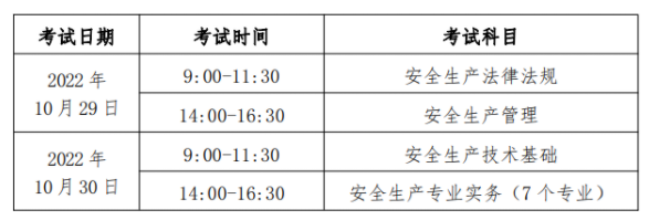 2022年注册安全工程师考试时间为10月29日、30日两天,考试科目为《安全生产法律法规》、《安全生产管理》、《安全生产技术基础》和《安全生产专业实务》,以下为具体考试科目顺序时间安排: