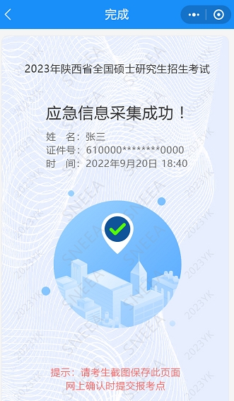 5、报名成功后,及时填报《2023年全国硕士研究生招生考试应急信息》,在网上确认是提交“应急信息采集成功”界面截图(考生姓名+手机号命名,获取方式见附件1)。