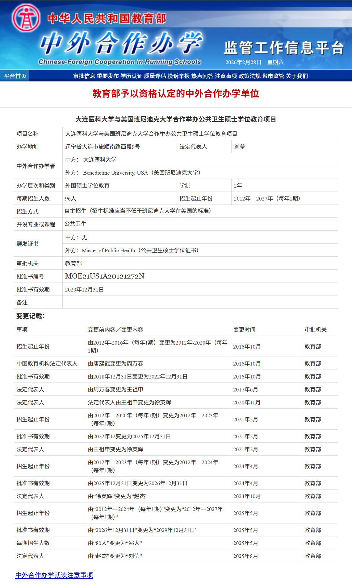 为适应高校教育国际化发展和对外交流,培养具有实践能力的高级公共卫生人才,经教育部批准,大连医科大学与美国班尼迪克大学合作举办公共卫生硕士学位教育项目[教育部中外合作办学项目批准书编号:MOE21US1A20121272N]于2013年正式开始招生。