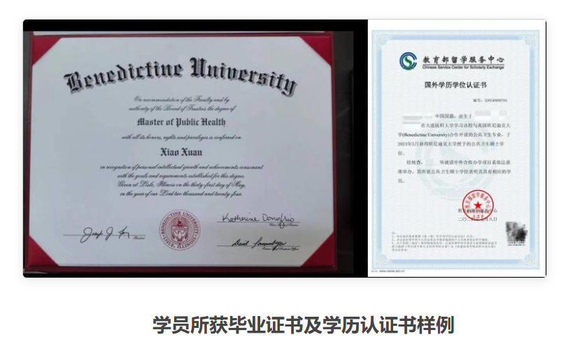 留学深造不出国门。本项目是教育部正式批准的中外合作办学项目,与美国班尼迪克大学合作培养公共卫生硕士。学生无需出国,在国内就能获得美国知名大学的硕士学位。所获美国硕士学位证书可在中国教育部留学服务中心进行学历学位认证,认证后效力等同于国内研究生双证。凭借该项目硕士文凭,学生既可在国内外就业,也可继续攻读博士学位。