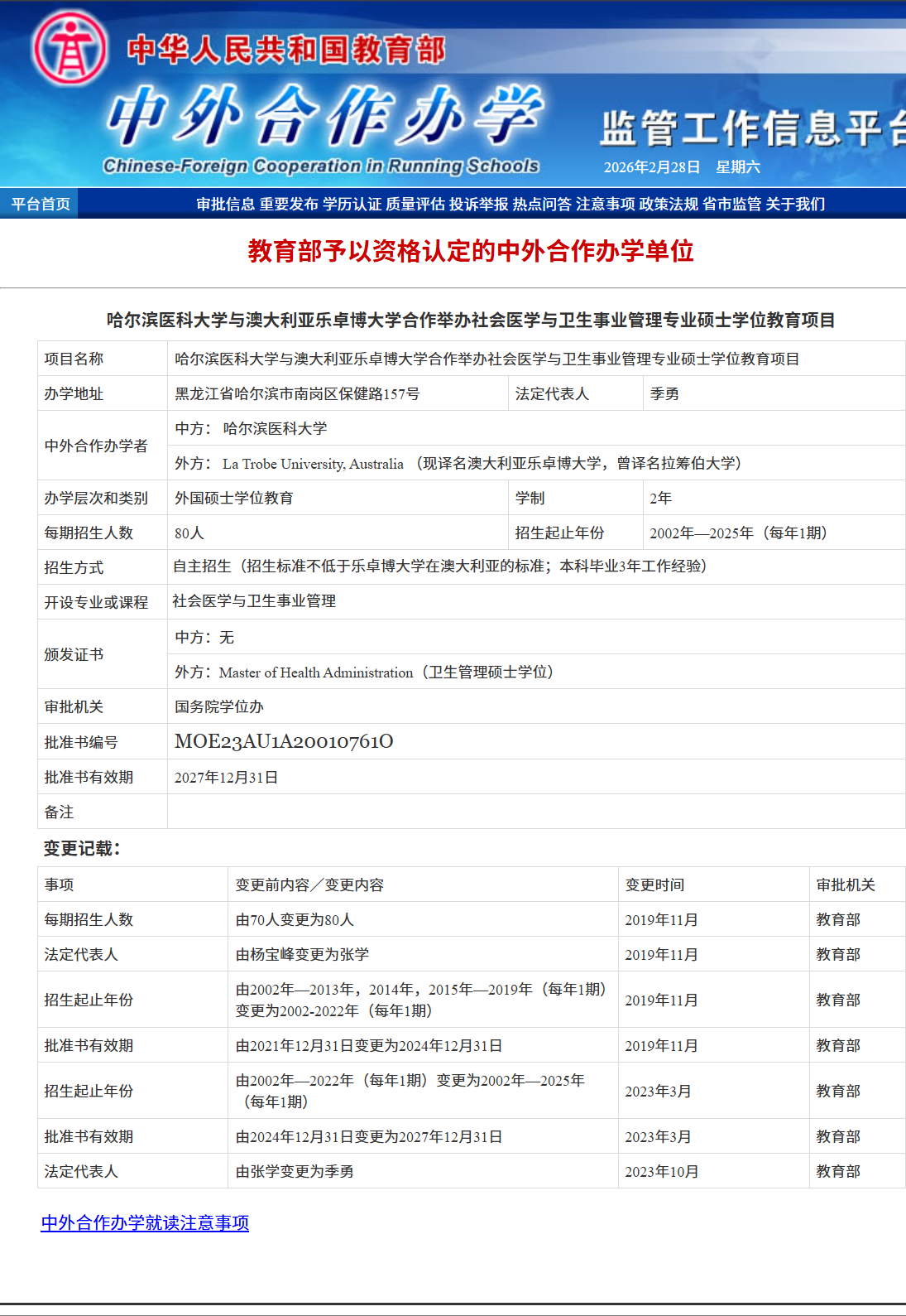 外方院校:乐卓博大学(La Trobe University,又译“拉筹伯大学”)建校于1967年,是澳大利亚维多利亚州第三所公立大学。现如今在墨尔本、悉尼等地拥有7个校区,共36,000余名学生,包括来自110个国家的8,000多名国际学生。在泰晤士2022全球大学排名中,乐卓博大学名列前1%,在全球排名前250。乐卓博大学还是QS五星大学,在教学、科研、国际化、就业、设施和创新能力等指标上均是五星水准。乐卓博大学中国卫生项目(China Health Program)成立1996年,是澳洲*一研究我国卫生的科研机构。