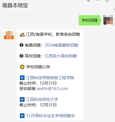 👉服务推荐:也可以点击下方名片,进入【南昌本地宝】,对话框回复【学校招聘】,即可获取江西科技学院2024年招聘报名方式、报名表,并查看更多江西学校招聘信息、联系方式等。
