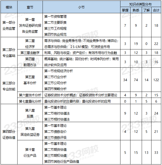 证券分析师考试专业性较强,包括业务监管、专业基础、专业技能、证券估值四大部分,涵盖金融学、经济学、数理方法、基本分析、技术分析、量化分析、股票、固定收益证券、衍生产品方面的知识。纯记忆型考题占比较低,计算题理解相对较难,近年来,计算题在考试中的比重在增大。建议考生购买考试相关用书或课程进行备考。各章节考试难度以及出题占比如下: