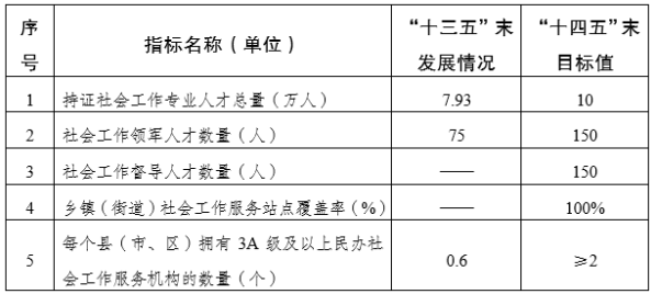 同时《规划》提到:到2025年,建设一支数量足、结构优、能力强、素质高的社会工作专业人才队伍,职业评价体系健全,专业岗位充足,整体工作走在全国前列。到2025年,全省持证社工要超过10万人;累计培养社会工作领军人才、督导人才各150名;乡镇(街道)社会工作服务站点覆盖率达到100%,每个县(市、区)拥有3A级及以上民办社会工作服务机构不少于2个。