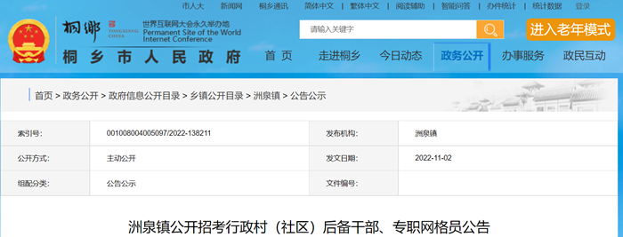 因工作需要,桐乡市洲泉镇决定面向社会公开招考行政村(社区)后备干部、专职网格员,现将有关事项公告如下: