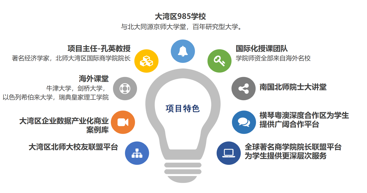 根据北京师范大学“一体两翼”的战略布局,湾区国际商学院立足粤港澳大湾区,背靠大湾区优势产业,积极发挥北京师范大学理论经济学、心理学、教育学、国家安全等品牌学科的优势,湾区国际商学院由著名管理经济学家孔英教授带领,召集近百位学界、产业界、商界、政界知名学者、企业家、专家,担任学院顾问、校外导师,着力打造产学研互动、互促的办学格局。