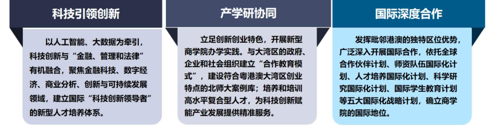 湾区国际商学院采取国际化的管理体系,依托粤港澳大湾区的时代背景,致力于打造世界名校、政府力量和顶级行业集团联动的高等教育输出平台,打破单一学科的传统培养体系,以数字经济、金融科技、低碳经济与绿色金融等交叉学科为方向,以人工智能、大数据技术为手段,融合科技创新与“金融、管理和法律”,聚焦金融科技、数字经济、商业分析、创新与可持续发展等主题领域,开展本科、硕士、博士和高管教育,广泛深入开展国际合作,探索产学研互动合作的新模式。