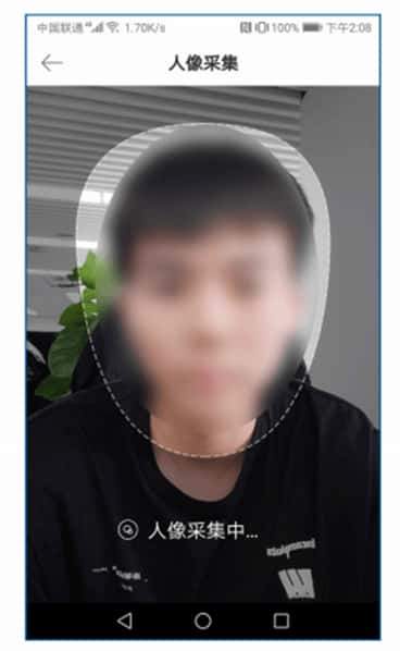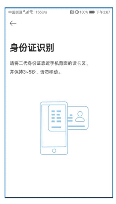 a.在身份证识别界面,将居民身份证靠近手机背部读卡区,并保持3~5秒不要移动,识别成功进入人像采集界面