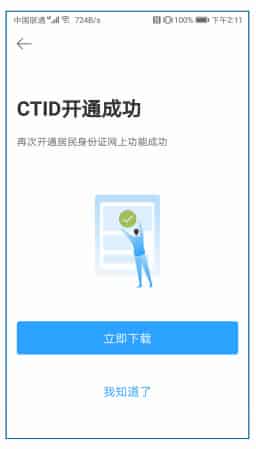 7.若CTID开通异常,请核实您输入信息是否正确重新操作。 若CTID开通成功,点击“立即下载”进入下一步或者“我知道了”稍后下载。