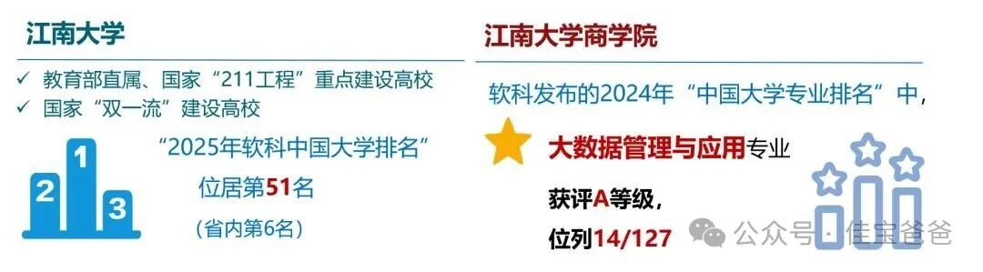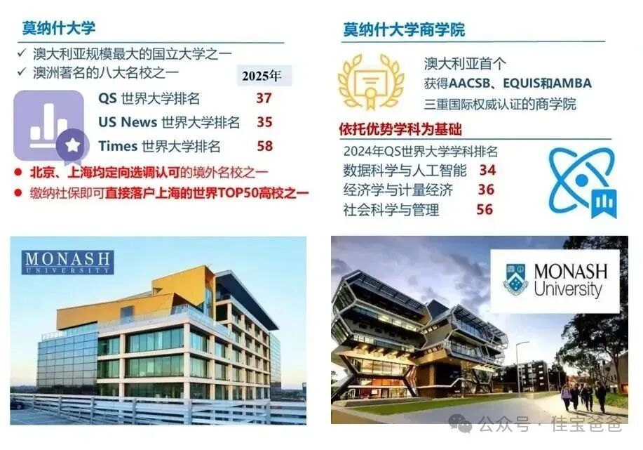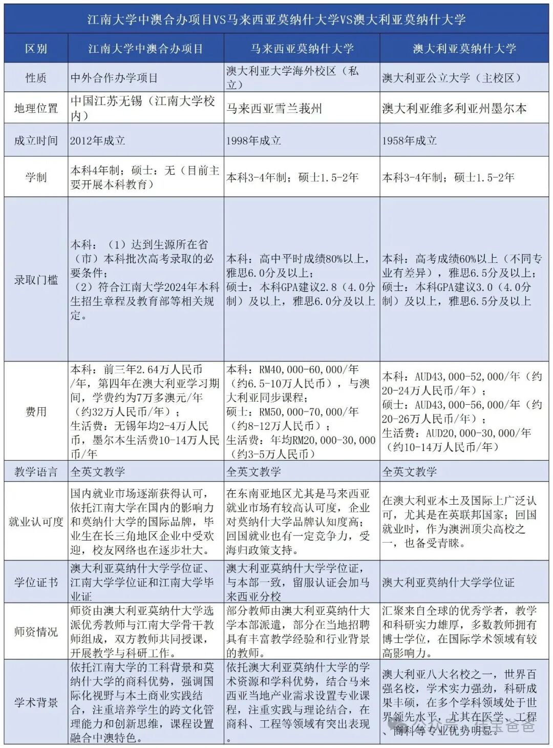 01 江南大学中澳合办项目&马来西亚莫纳什大学&澳大利亚莫纳什大学的关系和联系 02 江南大学中澳合办项目VS马来西亚莫纳什大学VS澳大利亚莫纳什大学的对比概览 03 江南大学中澳合办项目VS马来西亚莫纳什大学VS澳大利亚莫纳什大学的具体区别 费用情况、专业选择和学制、学科设置与教学质量、招生与学位授予 04 江南大学中澳合办项目VS马来西亚莫纳什大学VS澳大利亚莫纳什大学的热门专业 05 江南大学中澳合办项目VS马来西亚莫纳什大学VS澳大利亚莫纳什大学的申请门槛 马来西亚莫纳什硕士申请标准 澳大利亚莫纳什硕士申请标准 06 认可度与就业分析 江南大学中澳合办项目&马来西亚莫纳什大学&澳大利亚莫纳什大学的关系 马来西亚莫纳什大学:海外校区,1998年成立,位于雪兰莪州双威市,亚洲多元化学习氛围。 江南大学中澳合办项目:中外合作办学(中国教育部批准),2012年江南大学与澳大利亚莫纳什大学合办工商管理专业,2025年获批大数据管理与应用专业,采用“3+1”模式,学生前三年在江南大学学习,第四年赴澳大利亚莫纳什大学完成学业,毕业后获双方学位。 图源网络 一张图看懂江南大学中澳合办项目,马来西亚莫纳什大学和澳大利亚莫纳什大学的区别: ① 费用情况 本科专业,马来西亚莫纳什大学学费最便宜,澳大利亚莫纳什大学最贵,江南大学中澳合办项目由于第四年必须去澳大利亚莫纳什大学完成学业,所以学费在两者之间;住宿和生活费,马来西亚莫纳什大学比较便宜,相比较澳大利亚莫纳什大学就贵很多,江南大学中澳合办项目也是在两者之间。 ② 专业选择和学制 从本科的专业选择来说,澳大利亚莫纳什大学有100多个专业,马来西亚莫纳什大学专业数量约30个,江南大学中澳合办项目就只有工商管理和大数据管理与应用专业,且只面向部分省市招生。 ③ 学科设置与教学质量 学科设置 教学质量 三所院校在教学质量上都非常高,均采用全英文授课,澳大利亚莫纳什大学研究型课程占比更高,马来西亚莫纳什大学侧重多元化的学术交流,江南大学中澳合办项目由于采用“3+1”模式,学生能够兼得中外优质教育资源,获得中外文化熏陶。 ④ 招生与学位授予 澳大利亚莫纳什大学 马来西亚莫纳什大学 图源网络 澳大利亚莫纳什大学 马来西亚莫纳什大学 图源网络 对于本科院校背景、成绩等方面的综合评估,澳大利亚莫纳什大学的整体录取门槛会比马来西亚莫纳什大学高一点。江南大学中澳合办项目是本科项目,硕博项目由东南大学和莫纳什大学合作举办,本文不展开讨论。 澳大利亚莫纳什大学硕士申请标准 学术背景要求 一般要求GPA不低于3.0(4.0分制),985/211院校学生平均分需达到80分以上,双非院校学生需达到85分以上。 部分专业(如商科、管理类)可能要求申请人具备一定的工作经验,并提供雇主推荐信。 马来西亚莫纳什大学硕士申请标准 学历要求 图源网络 认可度与就业分析 与众多知名企业和机构有合作,为学生提供实习与就业机会,还提供职业规划、就业指导等服务。毕业生不仅在亚洲受青睐,也有机会在国际舞台发展。 (1)升学深造:学生海外升学涵括欧美、澳洲、日本、港澳台等境外名校,平均每年均有超过90%的毕业生继续升学与深造,就读的院校包括美国纽约大学、美国约翰霍普金斯大学、美国南加州大学、美国波士顿大学,澳大利亚墨尔本大学、悉尼大学、澳洲国立大学、莫纳什大学、英国布里斯托大学、英国帝国理工大学、英国伦敦国王学院、英国伦敦政治经济学院等世界知名学府。 (2)就业:毕业生就业范围较广,主要有以下几个职业领域:国际机构;世界500强企业;国内各级政府和企业管理部门;会计事务所、管理咨询、电子商务等高端服务业;银行、证券、保险公司等各类金融机构等。
